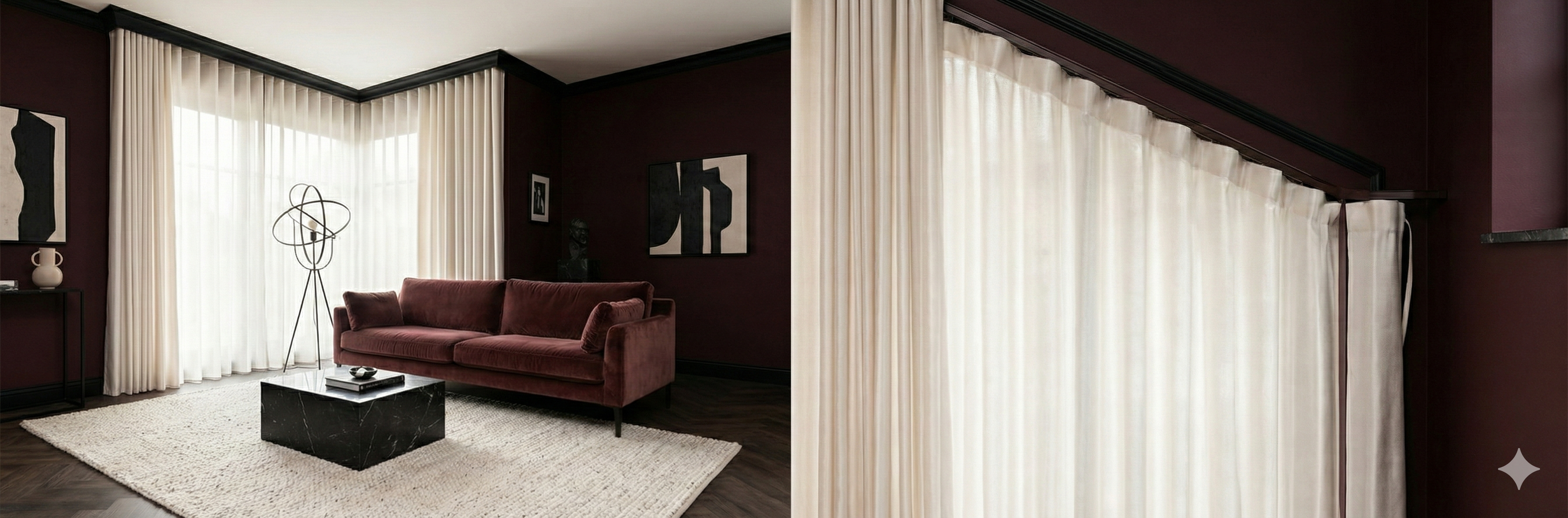 Si buscas un acabado digno de una revista de diseño, la cortina de ondas perfectas es la elección definitiva. Su sistema de caída continua crea líneas verticales fluidas y ordenadas que aportan una sensación de altura y amplitud a cualquier habitación. Es el estilo preferido por arquitectos e interioristas para vestir ventanales de piso a techo, logrando un look arquitectónico, limpio y extremadamente sofisticado.